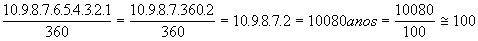 Portanto serão necessários 10! (fatorial de 10) dias, para esgotar todas as possibilidades. Vamos converter esse número em anos e, para isto vamos dividir por 360 dias (o mais exato seria dividir por 365 dias = 1 ano, mas o problema pede uma solução aproximada). Logo, vem: