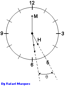 Exatamente neste momento, o ponteiro das horas (H) terá avançado um ângulo q e o ponteiro dos minutos (M) terá avançado um ângulo q + 150º , conforme se vê claramente na figura acima, pois ele terá avançado da posição 12 até a posição 5 e mais o ângulo q . Ora, de 12 a 5 existem 5 intervalos; como cada intervalo vale 30º, isto justifica o valor 150º pois 5.30º = 150º .