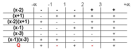-1 < x < 1 ou 2< x < 3 onde o quociente Q é negativo.