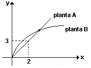 UNESP 2000 - Duas plantas de mesma espécie, A e B , que nasceram no mesmo dia, foram tratadas desde o início, com adubos diferentes. Um botânico mediu todos os dias o crescimento, em centímetros, destas plantas. Após 10 dias de observação, ele notou que o gráfico que representa o crescimento da planta A é uma reta passando por (2, 3) e o que representa o crescimento da planta B pode ser descrito pela lei matemática