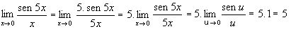 Observe que fizemos acima, uma mudança de variável, colocando 5x = u, de modo a cairmos num limite fundamental. Verifique também que ao multiplicarmos numerador e denominador da função dada por 5, a expressão não se altera. Usamos também a propriedade P4 vista no início do texto.