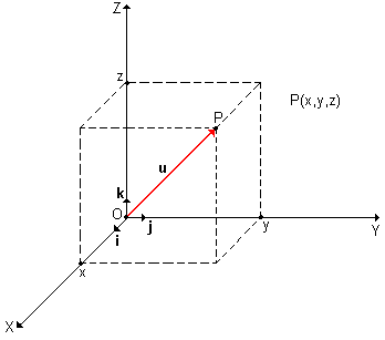 u = x.i + y.jAnalogamente, se em vez do plano R2, estivéssemos trabalhando no espaço R3, poderíamos considerar os versores i, j e k , respectivamente dos eixos Ox, Oy e Oz , conforme figura abaixo, e a representação do vetor u, no espaço seria: