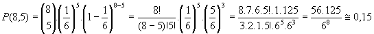 Lança-se um dado 8 vezes. Qual a probabilidade de sair exatamente 5 números iguais a 3?