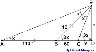 Considere a figura abaixo, construída obedecendo os dados do problema, ou seja: o ângulo inicial x, duplica (2x) quando o observador se aproxima 110 m e triplica (3x) quando ele se aproxima mais 50 m.