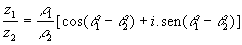 z1 . z2 = r 1 . r 2 [cos(q 1 + q 2) + i . sen(q 1 + q 2)]EXEMPLO: z1 = 15(cos30º + i . sen30º) e z2 = 3(cos60º + i . sen60º).