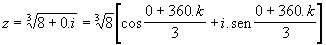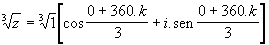 Sabemos que existem três raízes cúbicas; logo, fazendo k = 0, obteremos a primeira raiz: