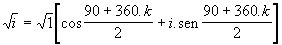 Progressão Aritmética de primeiro termo q / n e razão 360º / n.Sabendo disto, poderemos simplificar o cálculo das raízes de um número complexo.Por exemplo, vamos calcular as raízes quadradas da unidade imaginária:
