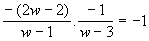 Podemos escrever para a 1ª reta: y = [-(2w-2) / (w-1)].x - w /(w-1).Analogamente para a 2ª reta: y = [-1 / (w-3)].x + 2w / (w-3). Ora, os coeficientes de x são os coeficientes angulares e, pelo que já sabemos, a condição de perpendicularidade é que o produto desses coeficientes angulares seja igual a -1. Logo: