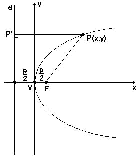 Observando a figura acima, consideremos os pontos: F(p/2, 0) - foco da parábola, e P(x,y) - um ponto qualquer da parábola. Considerando-se a definição acima, deveremos ter: PF = PP'