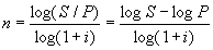 n = log (1+ i ) (S/P) . Portanto, usando logaritmo decimal (base 10), vem: